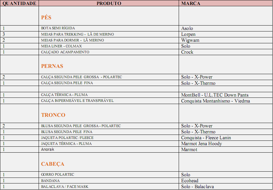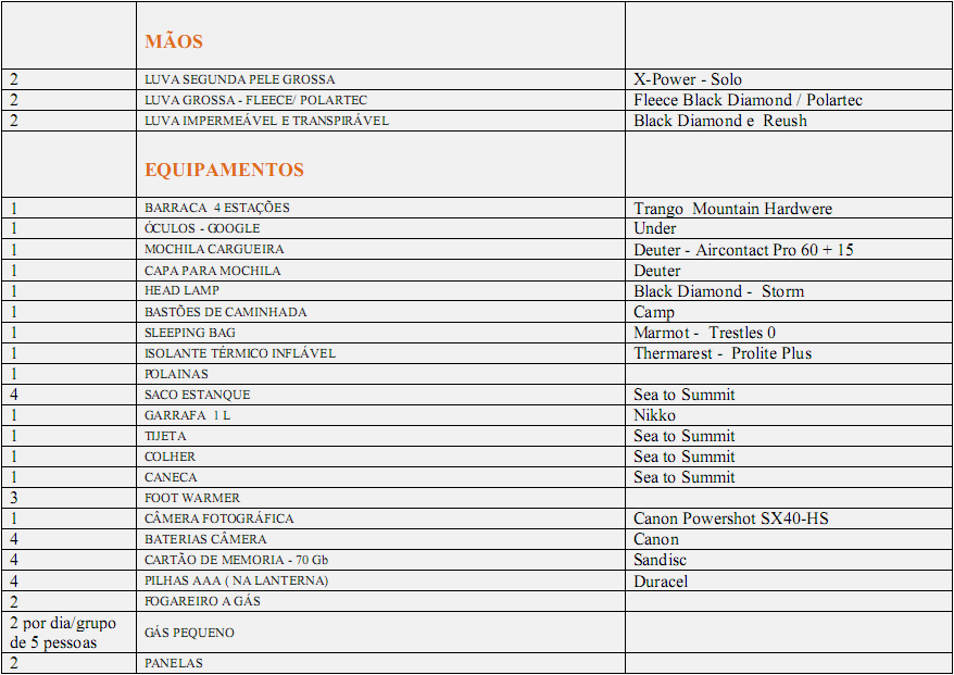 Segue abaixo, lista de equipamentos que utilizei na volta ao gelo continental patagônico sul.